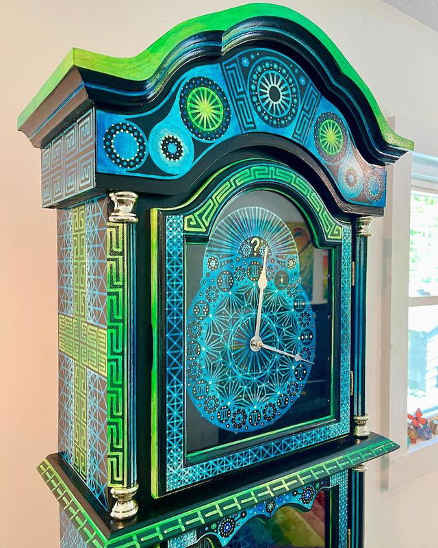 Gerundo recently shared on reddit the results of his recent transformation of a grandfather clock found in a thrift store to a modern and psychedelic piece that he mentally places in the “Frogwarts School of Licking the Toad.”