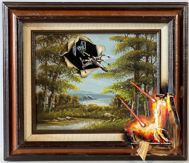 Pollot's most recent work has grabbed my attention. He's doing far more than just adding characters to paintings. He's actually tearing the canvas and reshaping the frame to add to the humor. For example, here's a TIE fighter and an X-wing in combat in and through the painting.