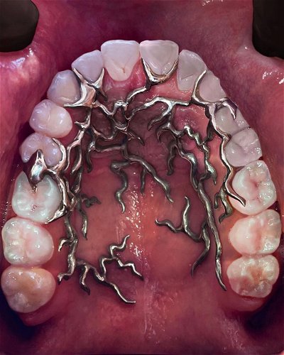 Many of them focus on dental jewelry. She shapes metals into novel forms that loop around the mouth, such as this piece that resembles a virus.