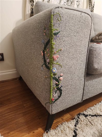 My Modern Met tells us that embroidery artist Stephanie Louise repaired her cat-modified couch with a floral and ivy pattern over the damage.