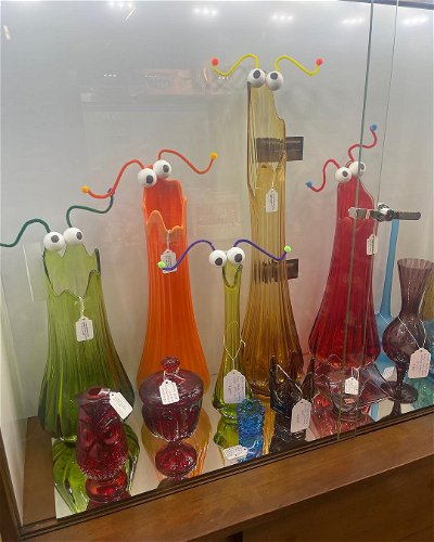 Atomic Shamrock Vintage, an antique seller in Wichita, Kansas, made these alterations to some vintage “Viking glass” pieces that it offers for sale. I love the idea of turning vintage glass into vintage Muppets!