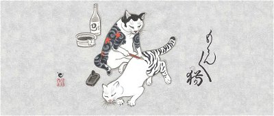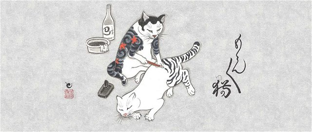 Kazuaki Horitomo is a tattoo artist in San Jose, California. His two passions -tattoos and cats- are combined in a series of images called Monmon Cats. These are cats inked in traditional Japanese motifs, and cats who are themselves tattoo artists for other cats. They are depicted employing the traditional Japanese art of tebori, or tattooing by hand. Long ago, Horitomo was inspired by his first cat, a stray his wife brought home, named Ginnan. Illustrating cats is his way of unlocking their spirituality. Each cat has its own personality and attitude, but all are genuinely serene, even while getting inked.