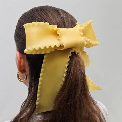 Bois is now offering her own line of food-inspired handbags, but that’s not what we’re going to focus on today. Take a look at this impressive barrette that appears to be made of lasagna. Is it actual lasagna? Given her past history, I’d say that Gab Bois would take the authentic route.