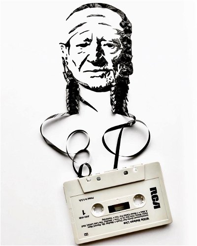Nowadays, this is a rare music medium even though the tapes are still in active production. So artist Amy Corson is content to tear up old cassette tapes into portraits of the musicians recorded on them. Here is, of course, the great Willie Nelson.