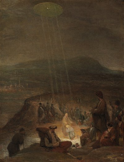 Our popular conception of an extraterrestrial aircraft is the classic "flying saucer," a term that came from a misinterpretation of a UFO description in 1947. But there were images and descriptions that came pretty close to the classic flying saucer shape long before that. And when we look back at Renaissance art, a curious number of those paintings seem to interpret messages from God in a curiously familiar saucer shape. The image above is titled Baptism of Christ by Aert de Gelder. Painted around the year 1710, it illustrates Matthew 3:16, "After Jesus was baptized, He went up immediately from the water. The heavens suddenly opened for Him, and He saw the Spirit of God descending like a dove and coming down on Him." Yet that doesn't look anything like a dove. It looks like a flying saucer. It's far from the only painting in which flying saucers take the place of heavenly phenomena. See more of these paintings and read of their interpretations at ArtNet. -via Boing Boing ā