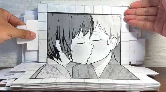 Japanese artist Shinrasinge has become virally famous for his pop-up books that tell complete stories with vividly mechanical animations. He’s especially fond of love stories, such as this sweet tale of a young couple in love.