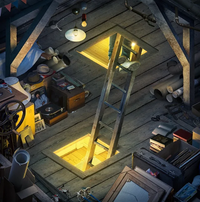 That's a pretty long ladder, sticking through both the floor and the ceiling of this level of the house. But wait, how is this possible? Are we looking at the floor or the ceiling? And where are we, when we are seeing this? How did this even come about?