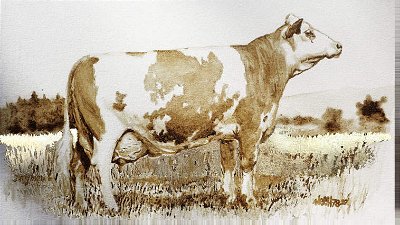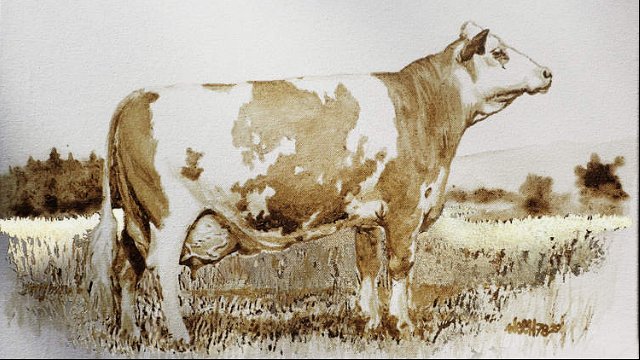 It’s something of a Platonic form of art—or cow manure—since this fine painting of a cow is made with real cow manure.