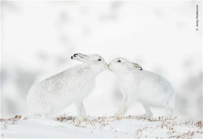 The winners of the Wildlife Photographer of the Year contest from the Natural History Museum were announced back in October, but the most coveted prize is the People's Choice Award, because that one is based on your votes. Out of almost 50,000 entries from 95 countries, the judges selected 25 finalists. They are all enchanting, giving us an up-close look at a world we may never see ourselves. In the picture above by Andy Parkinson, titled Tender Touch, two mountain hares in the Monadhliath Mountains of Scotland appear to have come to a mutual decision during mating season. The image below by Stefan Christmann, titled Troublemaker, looks like a scene from the movie Happy Feet. An emperor penguin and its chick are confronting an Adélie penguin. Adélie penguins sometimes interrupt a feeding session hoping to catch any food a clumsy emperor chick may drop, especially if he's "accidentally" bumped.